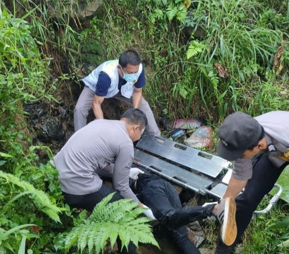 Saat melintasi jalan menurun diduga mengalami rem blong sehingga hilang kendali dan keluar jalur hingga akhirnya terjun ke jurang sedalam 2.5 meter.