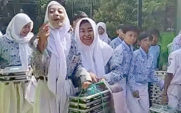 Sejumlah siswa kemudian mengembalikan makanan tersebut ke dapur SPPG yang berada tidak jauh dari sekolah. Wadah makanan dikumpulkan di depan dapur sebagai bentuk protes.