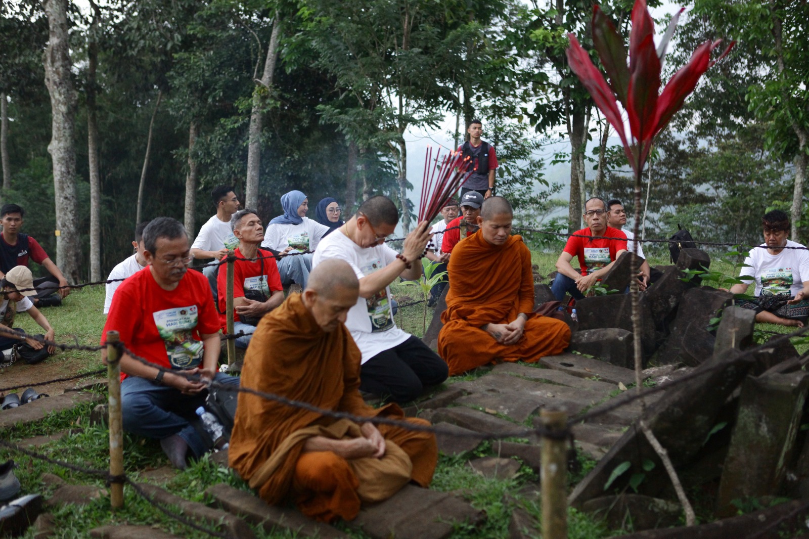 Doa dipusatkan di Teras 5 Gunung Padang, ruang hening yang sarat makna refleksi dan kesadaran, dengan melibatkan para bhiksu, insan pers, serta tokoh organisasi lintas komunitas.