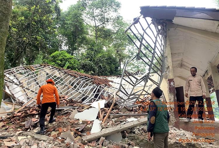Kegiatan Belajar Mengajar (KBM) di SDN Nangela, Kampung Nangela, Desa Nanggung, Kecamatan Nanggung, Kabupaten Bogor, Jawa Barat terpaksa dipindahkan ke majelis taklim setelah dua ruang kelas ambruk diterjang hujan deras dan angin kencang, Minggu, 31 Agustus 2025 malam. Foto : BPBD Kabupaten Bogor.