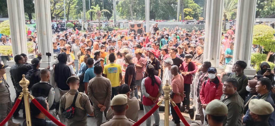 BogorOne.co.id | Kota Bogor – Ribuan sopir angkot mengepung Balai Kota Bogor, Senin 17 April 2023. Dalam aksinya mereka meminta Wali Kota Bogor Bima Arya menyetop operasional BisKita Trans Pakuan yang hingga kini masih gratis dan dinilai merugikan para sopir angkot.