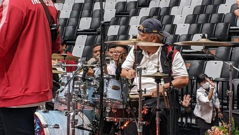 Menteri Basuki pun pada akhirnya  menyanggupinya dan langsung saja bergegas menuju posisi penabuh drum dengan gaya begitu percaya diri.