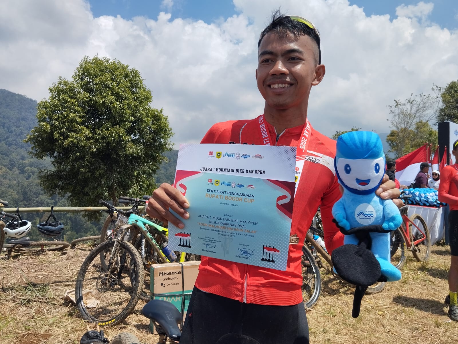 BogorOne.co.id | Kabupaten Bogor – Pesepeda asal Cileungsi, Kabupaten Bogor, Muhammad Dankin (20) meraih juara satu Kerjuaran Nasional (Kejurnas) “Tour Malasari to Halimun Salak” kategori open Mountain Bike (MTB) yang digelar di Kecamatan Nanggung, Kabupaten Bogor, Sabtu 23 Agustus 2025.