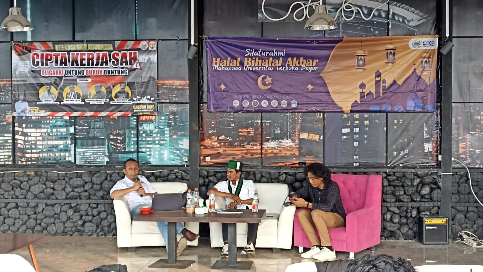 BogorOne.co.id | Kota Bogor – Memperingati Hari Buruh 1 Mei 2023, Komunitas Mahasiswa Universitas Terbuka (UT) Bogor melalui UKM Advokasi yang dikomandoi Rafy Billy Pratama gelar diskusi publik membedah untung rugi Undang-Undang Cipta Kerja yang telah disahkan dengan tema “Oligarki Untung Buruh Buntung”