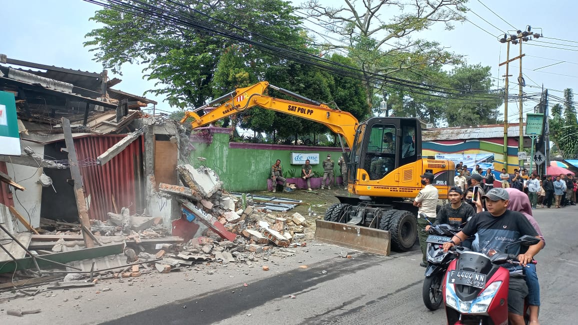 BogorOne.co.id | Cisarua – Empat kios permanen tak berizin di Jalan Kapten Harun Kabir atau Jalan Taman Safari, Desa Cibeureum, Kecamatan Cisarua, dibongkar memggunakan alat berat oleh Satuan Polisi Pamong Praja Kabupaten Bogor, Kamis (20/10/22)